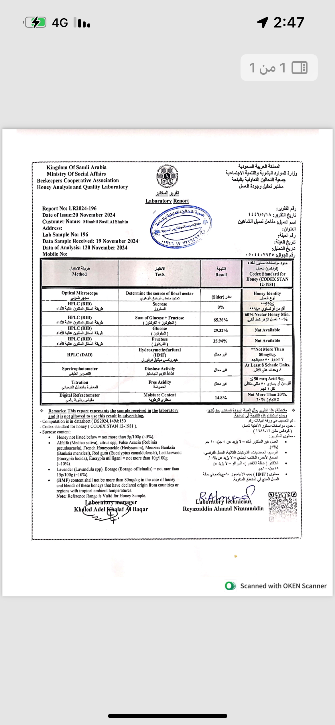 مطابقه للمواصفات والمقاييس لدى مختبرات جميعات النحالين بالممكله